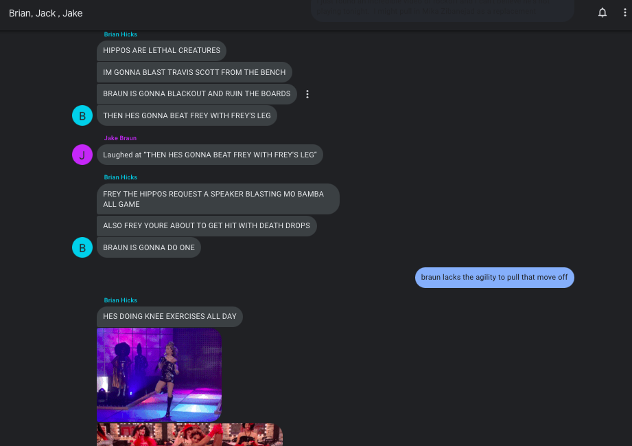 So now that we’ve demonstrated beyond the shadow of a doubt that if anything happens to me Hicks is to be arrested immediately, Zisser is to be the executor of my will and Caitlin should wait at least two months to date anyone out of respect unless they’re significantly better at hockey than I am in which case I totally understand, we now get to the matter of actually talking about the hockey game itself. Hicks spent literally hours studying D5 film last night (I will spare you the text screenshots as he was giving us a play-by-play in real time) and he and Braun will be wearing matching Roman Josi shirts tonight, ironic since neither of them play defense nor have much interest in backchecking or passing. In fact Hicks has not recorded an assist since August of 2019, a time period so long ago that he wasn’t married yet, Skinny Braun was Barrel Braun (stick tap to Jack for that fine bit of fat shaming) and Coronavirus sounded like it was an STD contracted by overzealous spring breakers in Acapulco. In the absence of Austin, Rockoff, Liang, Boyle and Rickard, blue will be pulling in the services of the German Braun, Florian, along with Joel “Damn You Jenn” Caldwell and John Walker who will receive a lifetime ban from D5 if he lets the Meatbox record a hat trick tonight. Yellow will be without the services of Brad but otherwise has all their big guns in the lineup tonight. With both teams wanting this victory more than they want to get any actual work done today it’s an exceedingly difficult game to handicap. Yellow has a mostly full roster but blue is coming out hot, led by rookie goalie Dr. Ryan Waldman who apparently began drinking at 6 AM today much to the chagrin of his patients today and the fine example of Alex Rockoff, out for this game but forever in our hearts after last week’s legendary play where he completely laid out and sacrificed his body in an attempt to stop a shot with 4 seconds left in a 5-2 game. Truly remarkable stuff here.