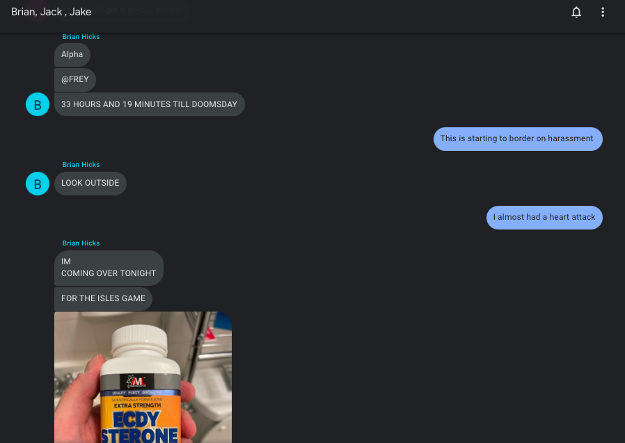 Notes: With apologies to the Meg/Jack UES Cup, this is the crown jewel of the regular season schedule, the most highly anticipated game of the season. Record high ratings. Sponsorships flowing in. Record rates of injuries and steroid hospitalizations. It can only mean one thing: at long last, the Fireball Bowl is back. A storied tradition unlike any other, it began in the inaugural Summer 2018 seasons as Team Sexy rattled off 9-3 and 6-2 wins before a 5-2 playoff victory played in the middle of a lightning storm (this actually happened, 2018 was wild). The Hippos stormed back with an electric OT win in Fall 2018 that jumpstarted their push to the finals and ensured that Avery never registered for D5 again. Spring 2019’s iteration was another OT classic that featured the first overturned by video review shootout goal in league history as Adam Herman shadily took two steps backwards on his attempt only for Courtney to end it on the very next shot. Summer 2019 saw blue missing a ton of players and facing a team called The Ronkonkoma Condos (what a time to be alive that was) and put down by one of the most physical lines in D5 history, Eli/Susie/The Q Train. Fall 2019 saw the Bandits prevail over the Hippos in one of the most physical games in league history, punctuated by Karsten scoring the winner with just over a minute left and Hogg breaking my toe. The Hippos got their revenge in the playoffs with a final four victory before falling in an upset to the Probert-less Hooligans…and finally, after a long history lesson that maybe five people read, we come to today. While I wish I could tell you this is just an ordinary ball hockey game between two .500 teams looking to jump into the top 3 in the standings, there is a lot going on here. Over the past 29 hours, beginning at 9:30 AM yesterday, I have been the target of an insane, steroid fueled intimidation campaign the likes of which we’ve never seen. At one point Hicks told me he was outside my window and I actually thought he might be out there.
