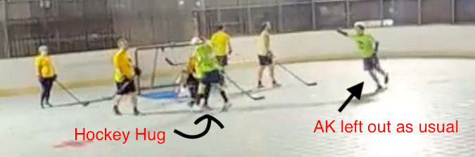 The Hippos tied it on the very next shift and it stayed tied until just 5:11 remained when AK buried a rebound off a Probert shot to put green ahead. Then with 1:30 left poor coverage by the Hippos led to Jess being alone in front with all day to pick her shot and she chose bar-down to give green a two goal lead and make Probert happier than anyone at the rink except for Scotty.