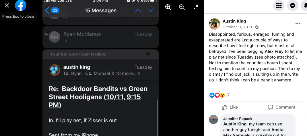 Spring 2021: Learning our lesson from the previous spring, Tunas are scheduled to open the season against the Hippos and do so in the first game in league history that features both teams starting with six skaters and empty nets, as both goalies have trouble adjusting to their post-zoom lives and are super late. Amazingly, only one goal is scored on the double empty nets, by Mike T who tells me that his shot was so good it would’ve gone in even with a goalie. Game is tied 3-3 late before Tunas bury one with 13 seconds left to win the first game of the return-to-play season. They follow that up with a 4-1 win in a game featuring a touching tribute to Jack’s father before the Hippos take the final meeting in Minigame Madness. This season also featured basically nonstop lobbying by Hicks/Jack to turn their three game season series into a winner-take-all whereby whomever won the series received 9 points and the loser received zero. They referred to this by a name which I will not mention here because I don’t want them to get canceled (yet).