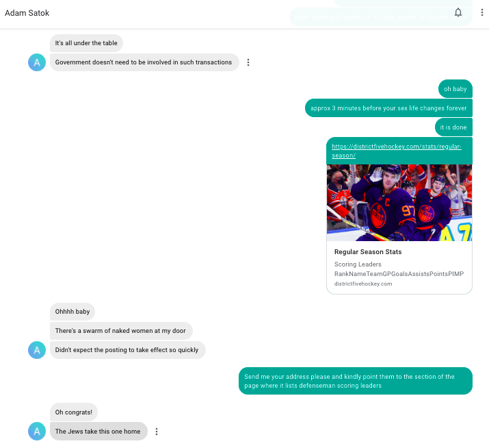 GAME NOTES: The first 16:10 of this game was played on 7/7 with the remainder completed on Friday night. The common theme: goals. 4-1 when the game was stopped, this ended up tying a league record for goals in a game off the strength of an eight goal third period which gave the Hippos the 6 seed…in one of the shadiest events in league history, Satok won the scoring title on the back of two empty netters in the final minute of play when white left their goalie pulled down 3 and then 4 goals. I would not be surprised to see massive live bets on Satok scoring title coming in from fake IP addresses in Montreal right around 8:10. Needless to say, there will be a full investigation into Simon, Satok and anyone else involved in these shenanigans.