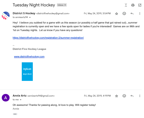 Annie subbed in a D5 game one day in Spring 2019 when Jenn’s team was badly short so Hogg brought in some random What The Puck subs. Planning out the summer season, I made the incredibly consequential decision to track down her email and hit her up about it.