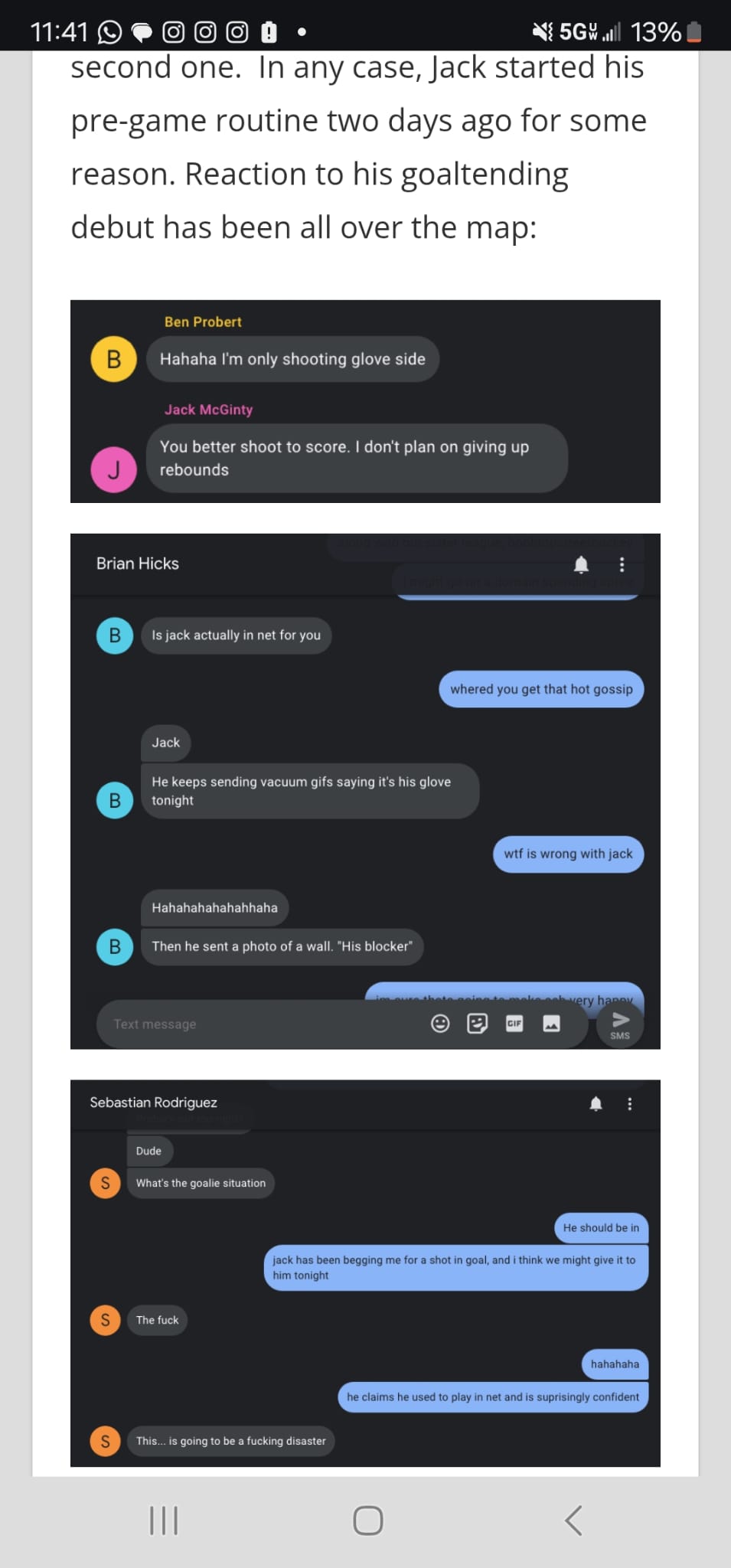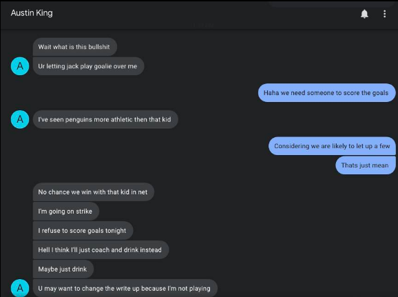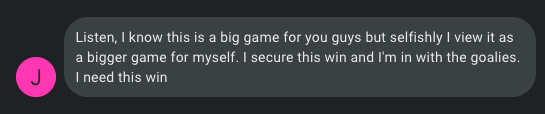 Although he may have lost that game in OT, most reports even by previously skeptical league members were that he played well. It was a real Rocky type ending; he lost, but he won some respect. Not enough for people to start giving him consistent starts in net, but some. And so it was that after the whole Covid ordeal, once ball hockey came back and goalies were once again in short supply, I tapped him again to sub for LBS against Cobra Kai. Let’s just say excitement was high…from Jack.