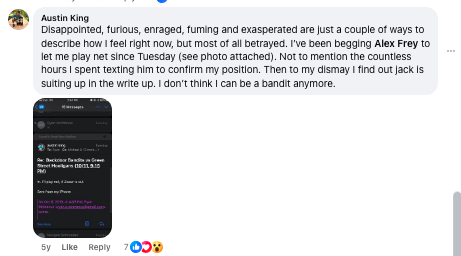 Fast forward a few weeks and whispers were abound that other players, many of whom were doing power hours with myself and Meg on a near weekly basis, were trying to get in on the action. And so it was that on a random Friday night in October, when I was missing my first D5 game of all time at a wedding in Nashville years before I would know that city for being the place where Hicks spends thousands of dollars on funny signs and the rest of the team makes bets on how long Zisser will survive in Whiskey Row before ejection, I signed a lucrative rookie contract with The Jackuum to make his debut in net for a 2nd place blue team with championship aspirations. As you might expect, reaction was…mixed.
