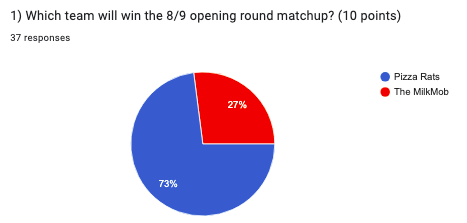 Notes: Cup Size vs either Milk or Rats is pretty similar in terms of both matchup strength and public perception to what the previously mentioned blue vs these teams matchup would have been. They’re a multigoal favorite, despite taking a 21-0 loss to MilkMob in their season finale (ok, that game was a forfeit). But the real treat will be a blue vs black matchup which was supposed to happen on the final night of the regular season and would have given blue a chance at the 4 seed but was moved around when multiple weeks got rained out. The public is fairly split with the edge to the 5 seed.