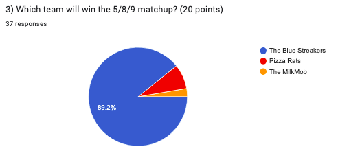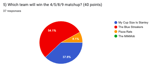 73% vs 27% is a split we normally see reserved for something like a 1v4 matchup or a 5v8, yet these teams were separated by one spot in the standings. Of course, Cup Size taking D5’s first ever forfeit in the season finale handed MilkMob the win (and also made them the league’s highest scoring team by virtue of an official 21-0 victory) but I don’t see this game being a blowout either way, especially with Jeff and APK in nets. I’m a big MilkMob fan and have season tickets, but I do see the rats likely prevailing on the strength of playoff Meatbox and Maddy’s career season. 4-2 teal.