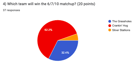 Notes: These teams met early in the season and despite what you (and the public) likely assume, the Stallions mounted an impressive comeback and held on for a 5-4 win. The Stallions in fact were rated fairly high in the preseason power ranks and were in the middle of the pack standings-wise until a late season swoon that not coincidentally coincided with Ken missing the last five games of the season. I’m expecting a full lineup for them tonight while Hog will have Andrew Gillen and Kate Hall with Sanchick, Nick and Ellie out for the season. It’s been an up-and-down season for maroon but they do seem to have mostly rounded into form these past few weeks, even if they’re not quite as overpowering as they have been in past seasons. The public certainly seems to think they have enough to roll through this one. I’m not sure if I’m willing to go that far as silver is a gritty team with a ton of veteran savvy. Hog to prevail, Stallions to cover.